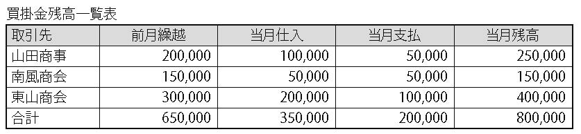 仕入先元帳を月末で締め切った場合の「前月繰越」「当月仕入」「当月支払」「当月残高」の4 つの項目を一覧にして「買掛金残高一覧表」を作成し、仕入先元帳と総勘定元帳の買掛金残高の金額と照合して記入漏れ等がないかを確認するのに役立てます。この時に、不備等が発見できたらその場で修正します。